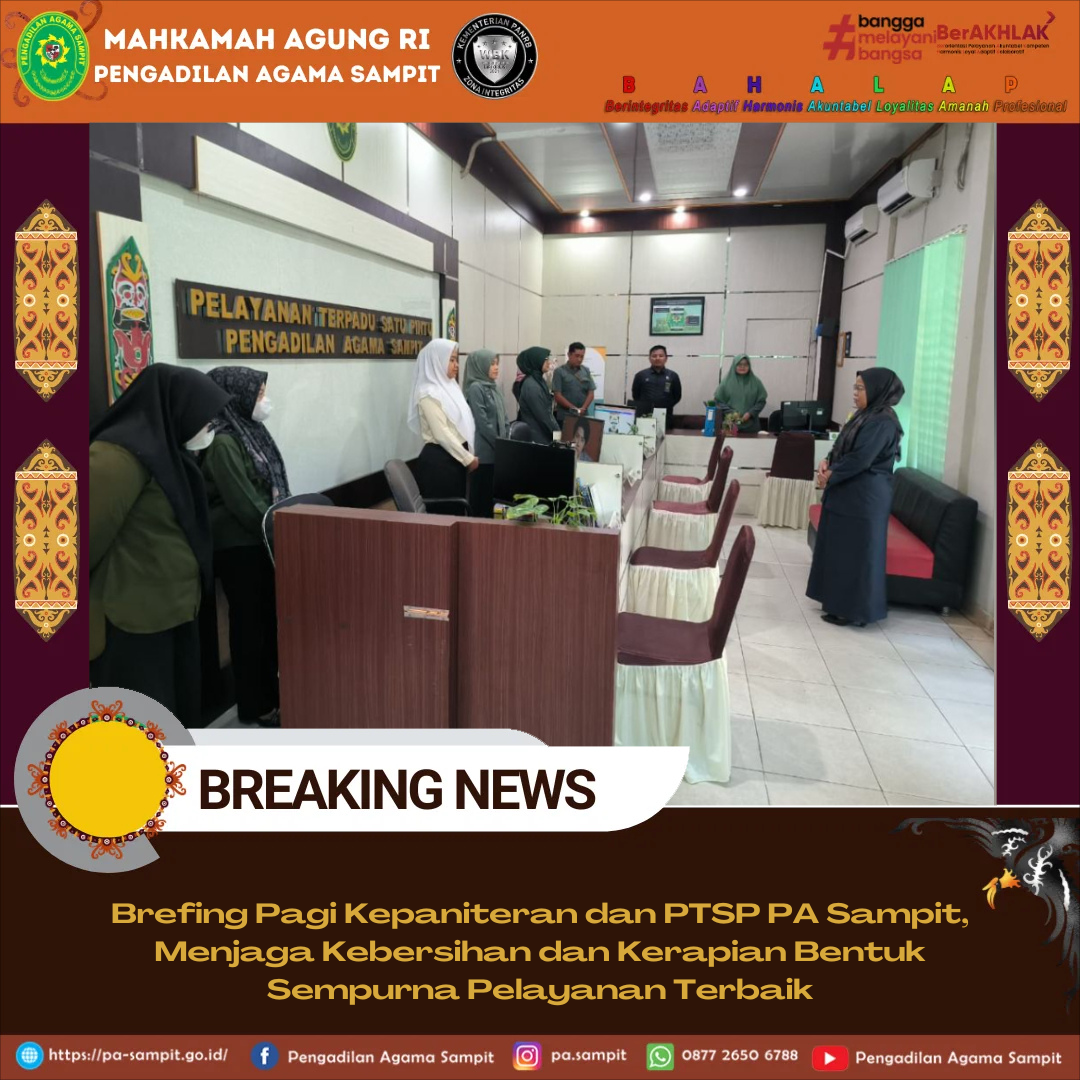 Selasa, (14/04/2026) Pengadilan Agama Sampit kembali menggelar kegiatan briefing kepaniteraan dan PTSP Pengadilan Agama Sampit sebagai bagian dari upaya pembinaan internal demi meningkatkan kualitas pelayanan publik. Adapun yang bertindak sebagai pembina briefing pada kali ini adalah Panitera Muda Gugatan Pengadilan Agama Sampit, Ibu Dwi Purwatiningsih, S.H.. Kegiatan ini diikuti oleh seluruh unsur Kepaniteraan serta petugas Pelayanan Terpadu Satu Pintu (PTSP) dan Pos Bantuan Hukum (POSBAKUM).