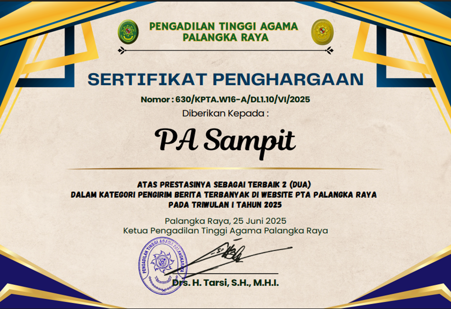 Komitmen Pengadilan Agama Sampit Kelas IB dalam menyebarluaskan layanan informasi dan publikasi kegiatan satuan kerja kembali menuai apresiasi. Dalam Rapat Koordinasi Pengadilan Tinggi Agama Palangkaraya dan Pengadilan Agama Se Kalimantan Tengah Tahun 2025 yang dilaksanakan Pengadilan Tinggi Agama Palangka Raya, Pengadilan Agama Sampit menerima piagam penghargaan juara II dalam kategori pengiriman berita terbanyak Triwulan I Tahun 2025. Kegiatan tersebut dibuka langsung oleh Ketua PTA Palangkaraya, Drs. H. Tarsi, S.H.I., M.H.
